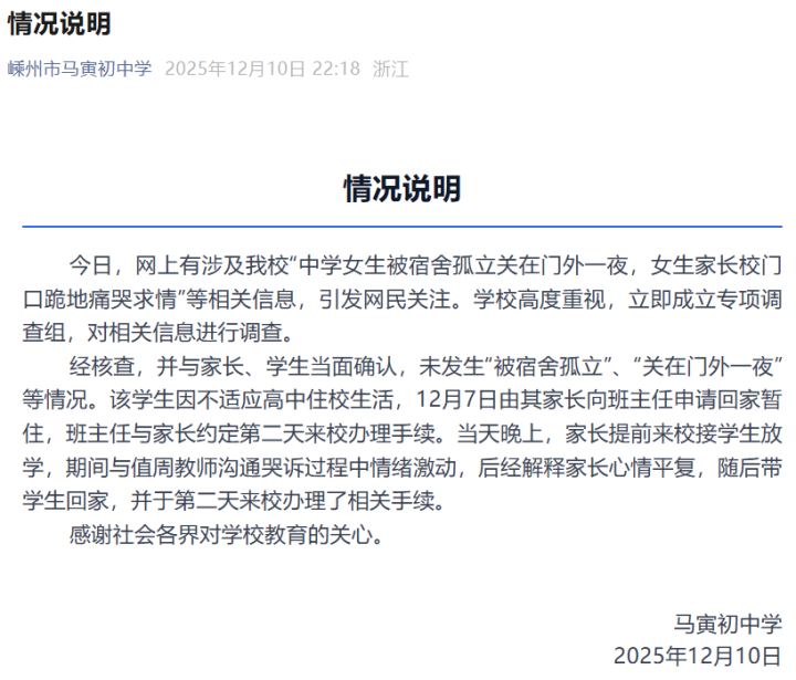 据浙江嵊州市马寅初中学微信公众号消息,12月10日,马寅初中学发布情况说明: